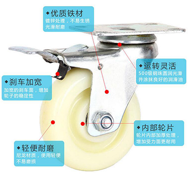 主要分為:塑料腳輪、尼龍腳輪、鋼鐵腳輪、耐高溫酚醛樹脂腳輪、橡版膠腳輪、PVC腳輪、TPE靜音腳輪等。另外除了主要的腳輪材質之外,腳輪材質還有鑄鐵鑄鋼、丁腈橡膠腳輪(NBR)、丁腈膠、天然橡膠腳輪、硅氟橡膠腳輪、氯丁橡膠腳輪、丁基橡膠腳輪、...23